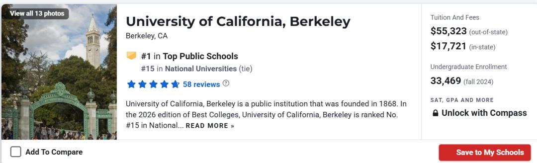 在前两年的 U.S.News 公立大学排名中,UCLA和UCB连续两年并列第一。去年,UCLA 拿下了****,而今年UCB又重新“杀”回来,抢回了“全美第一公立大学”的宝座。