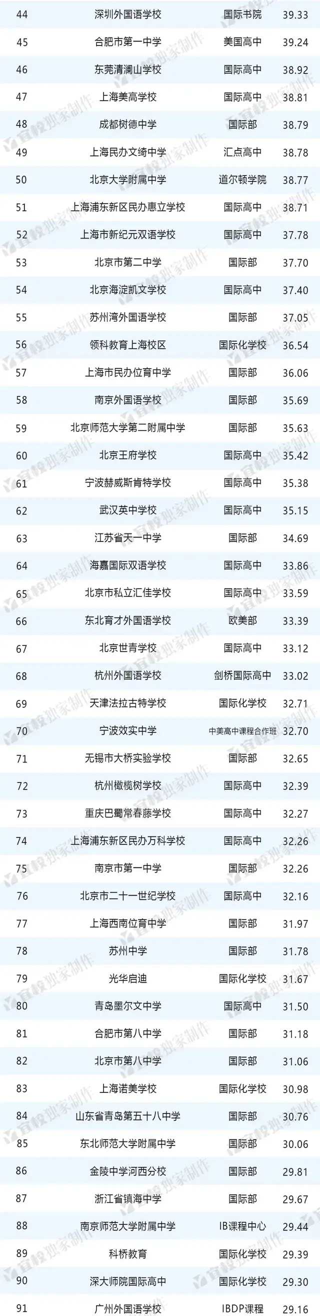 四川的成都外国语学校、成都树德中学分别排在第34名和第48名;重庆有三所学校上榜,分别是重庆市南开中学校(29名)、重庆市育才中学校(31名)、重庆巴蜀常春藤学校(73名),它们堪称成渝经济圈国际教育的中坚力量;武汉英中学校作为湖北省的“独苗”,排名第62。