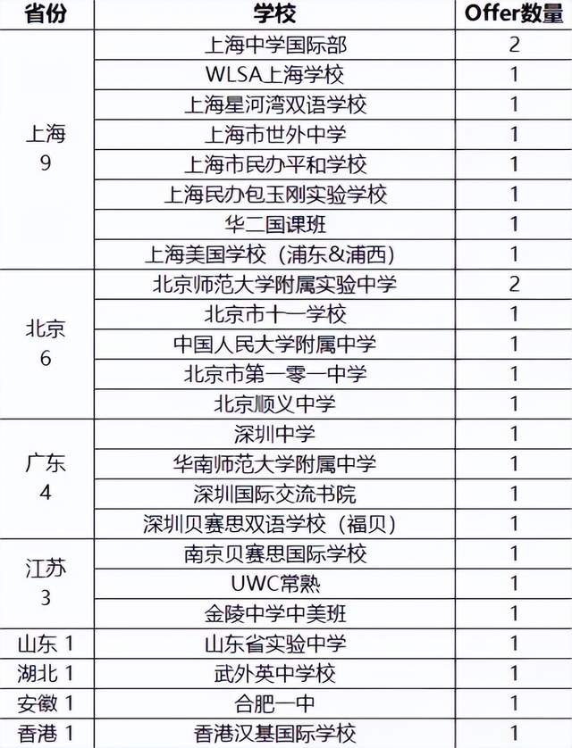 UWC拿到了2枚录取,领先于其他学校。其次WLSA上海、上海美国学校浦西校区、北京四中国际部,深圳新哲文院,香港汉基国际学校、上海新加坡国际学校均有一枚录取。海外高中总共有9人拿到录取。