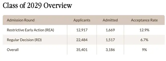 虽然学校尚未公布2030届的早申数据,但在2029届,共有12,917 名学生通过早申轮次申请,较前一年的11,498人显著增长。早申录取率为12.9%,常规轮录取率为6.7%。