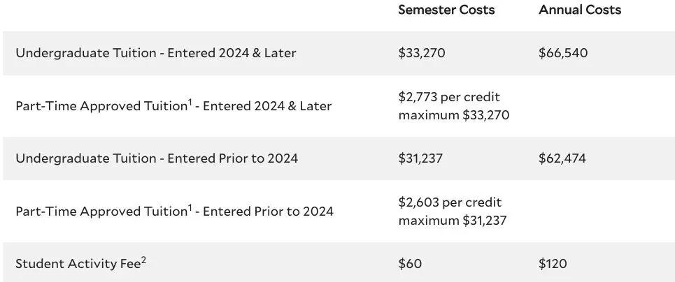 莱斯大学,2024年及以后入学的本科生学费每年为66,540美元,算上其他的食宿、活动费和杂费等总共费用在87,047美元。