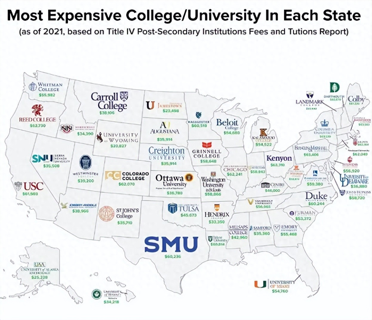 注:上图显示的最贵大学是根据2021年的学费统计的,到了2025年,结果会有些变化。另外,制作者统计的应该是美国学生的学费,而本文讨论的是包含国际学生的学费和其他生活开支在内的总费用。