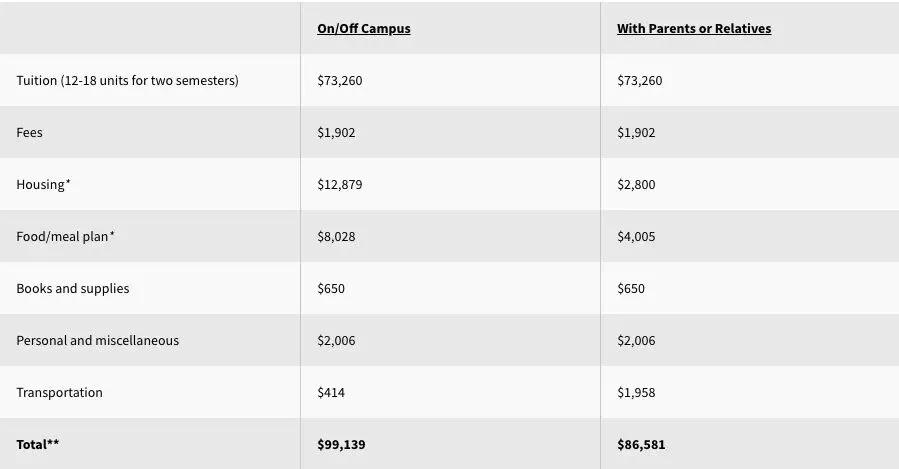 根据上图显示加州最贵的是南加大,小亨查看了其官网,2025-26学年预估的学费和各项开支的总费用约为99,139美元(不住校)。