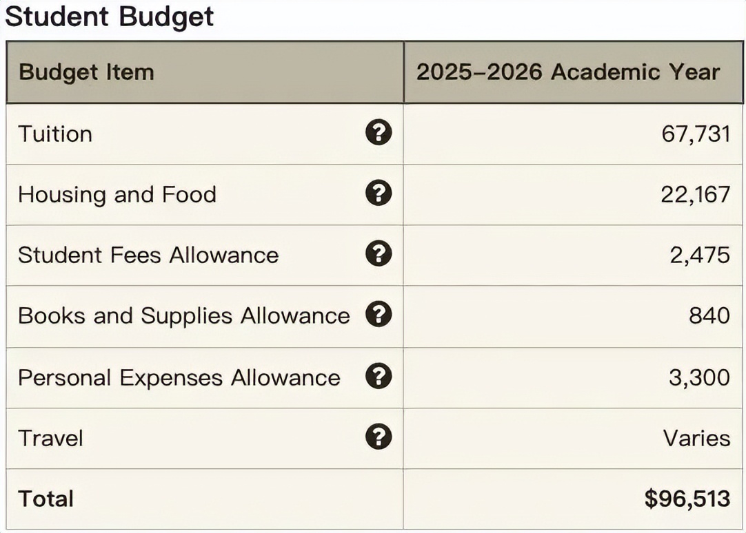再来看同样是加州顶尖私立学校的斯坦福,其官网显示,2025-26学年预估的总费用为96,513美元。