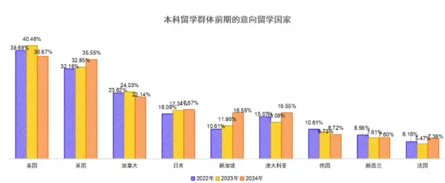 2022-24年本科留学群体前期的意向留学国家:本科留学,大家最想去的是美国。美国本科有很多世界排名前100的高校,学历含金量超高,这是吸引学生的关键因素。