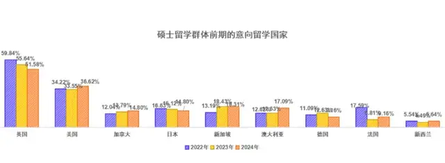 2022-24年硕士留学群体前期的意向留学国家:硕士留学意向第一的则是英国,英国授课型硕士课程通常一年就能读完,对于想快速就业的同学来说,吸引力十足。