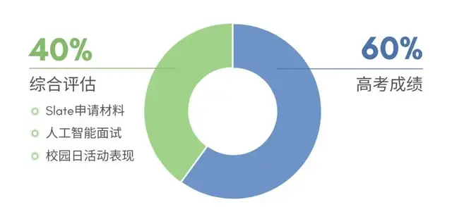 高考成绩(权重60%)、以及学校自主综合评估成绩 (权重40%,包括对Slate入学申请材料和人工智能面试结果的评估以及申请者“校园日活动”表现),按照“6-4”模式进行综合评分,择优录取。
