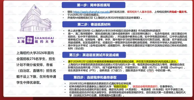 所有申请报考上海纽约大学的学生,都必须登录“上海纽约大学本科申请系统”进行实名注册,根据系统提示填写相关个人基本信息,上传相应资料并完成一篇文书,于2026年2月1日前在线提交,并使用A4规格纸张打印《上海纽约大学2026年校园日活动申请表》。