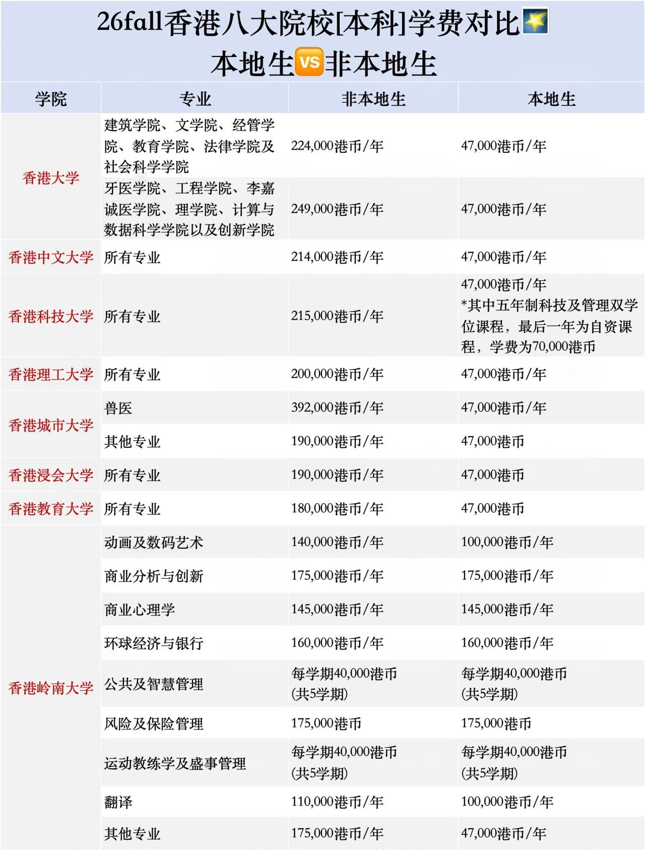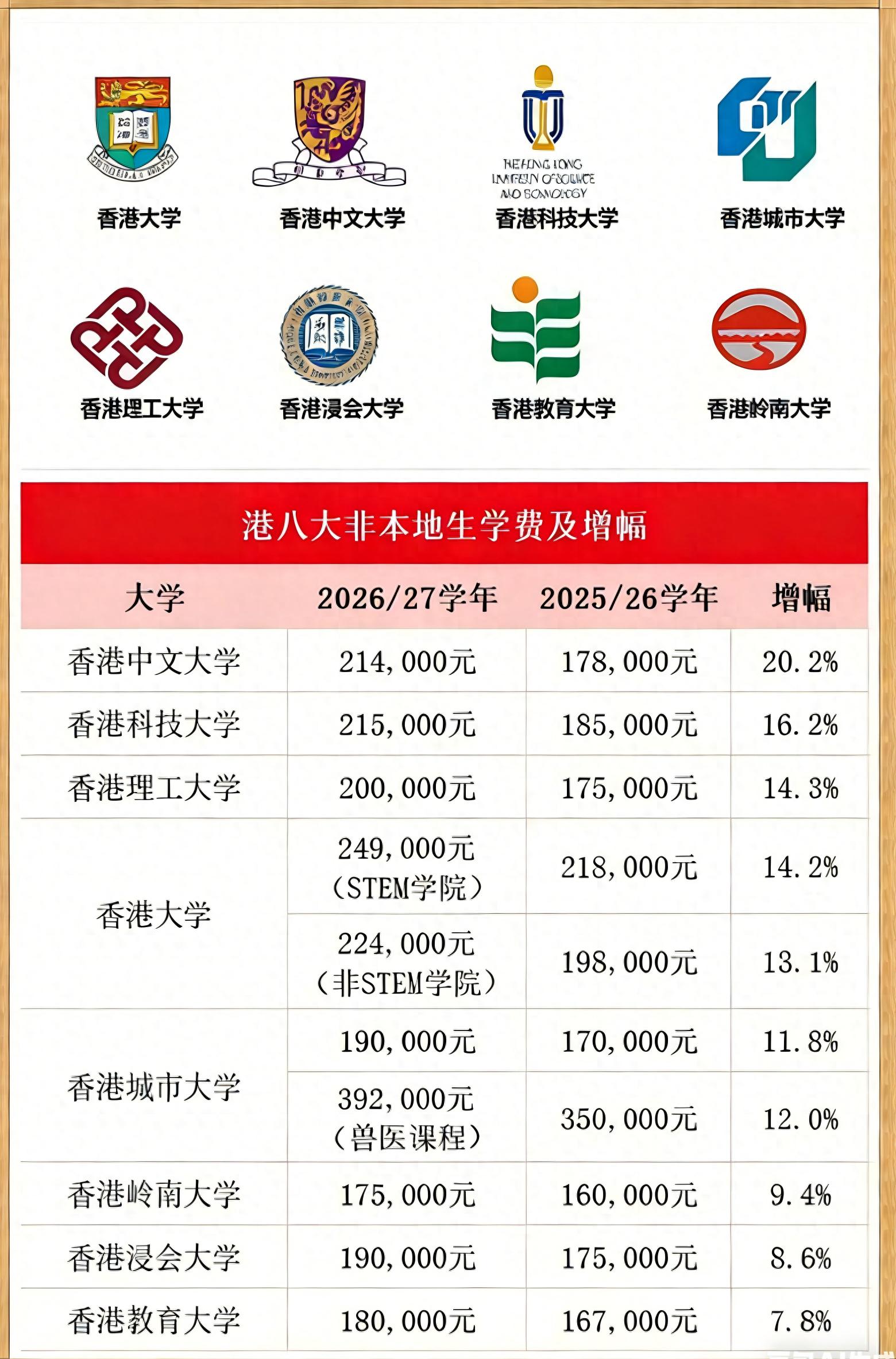 打算申请香港高校的同学和家长注意了,继2025/26学年学费调整后,2026/27学年港八大非本地生学费再次全线上涨,部分本科专业学费逼近25万港元,创下1997年以来的学费新高。
