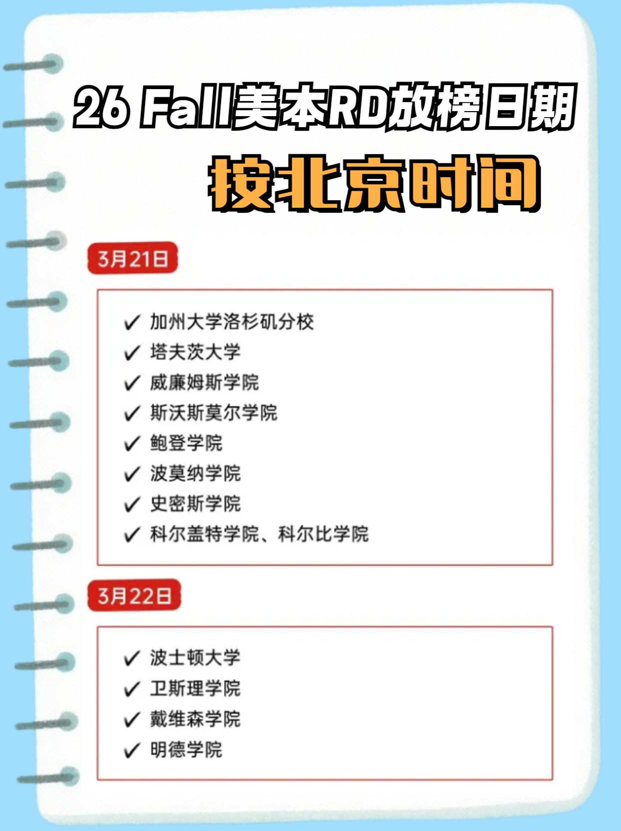 根据历年数据和各校消息,绝大多数Top50综合性大学和Top30文理学院的RD结果,都将在3月中旬至4月1日之间密集发布。P1-P5小亨整理了最新的RD放榜时间以供参考(注:时间为北京时间,请以官方最终通知为准。)