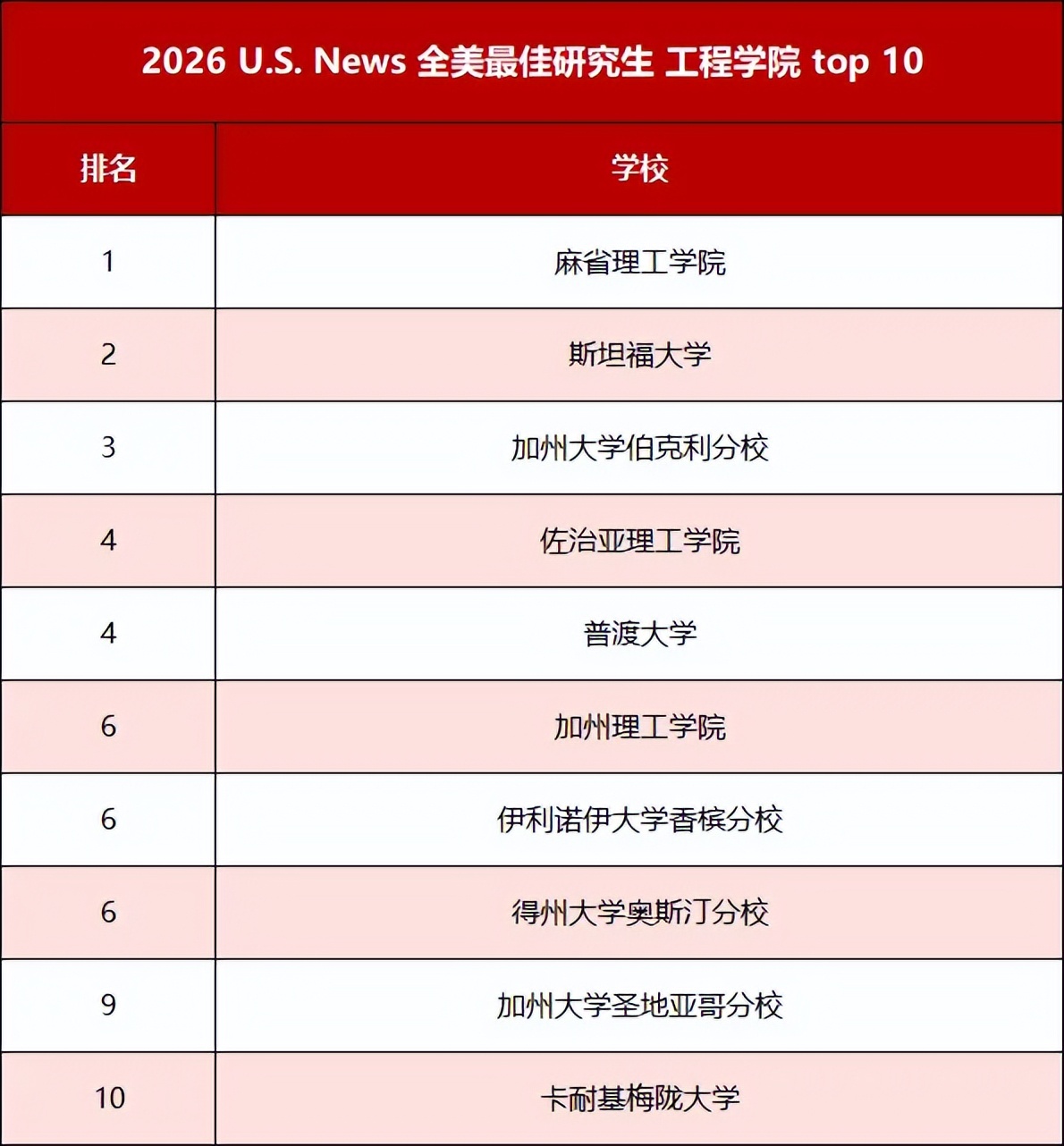 佐治亚理工学院与普渡大学并列第四,加州理工滑落至第六。