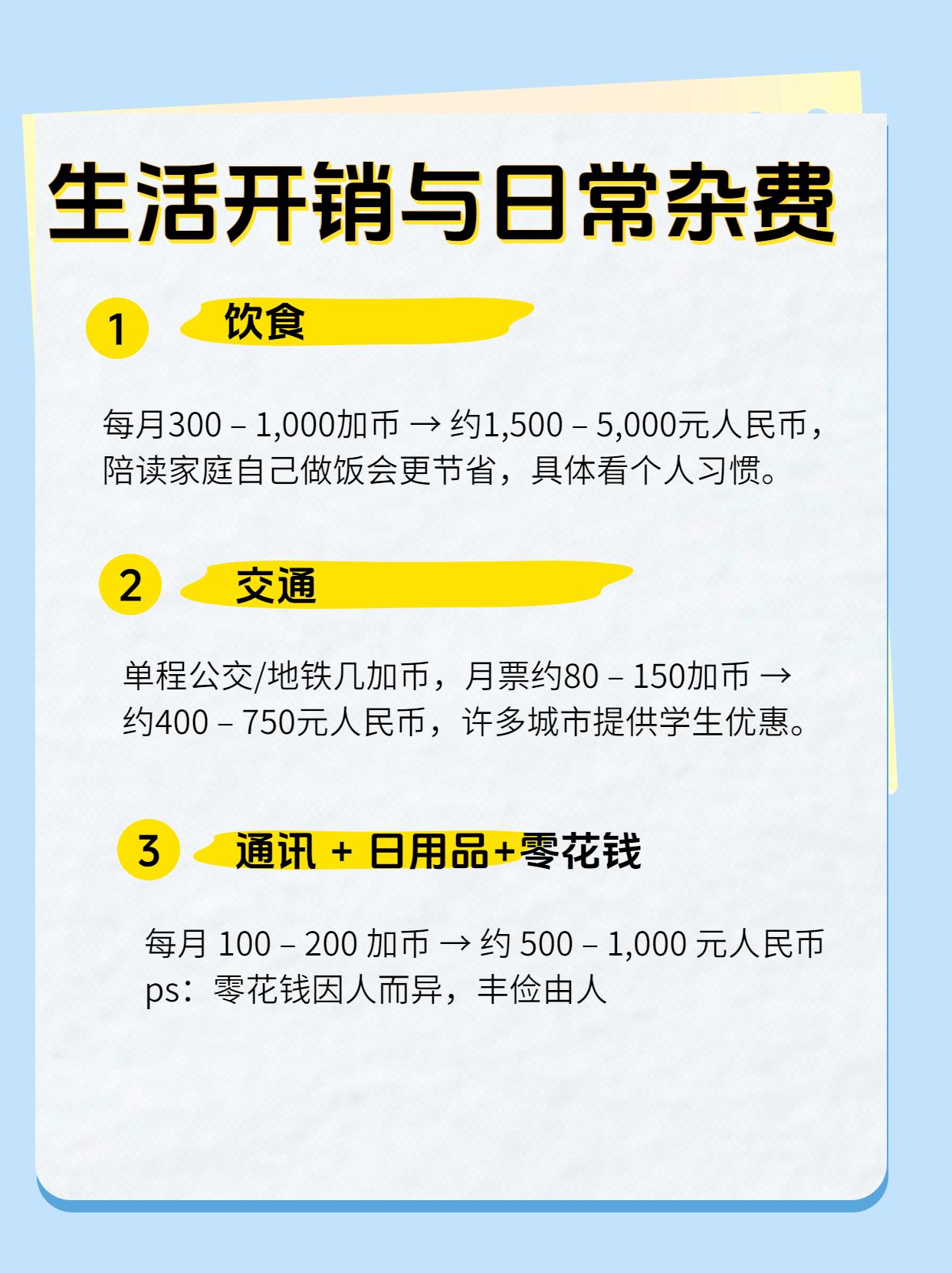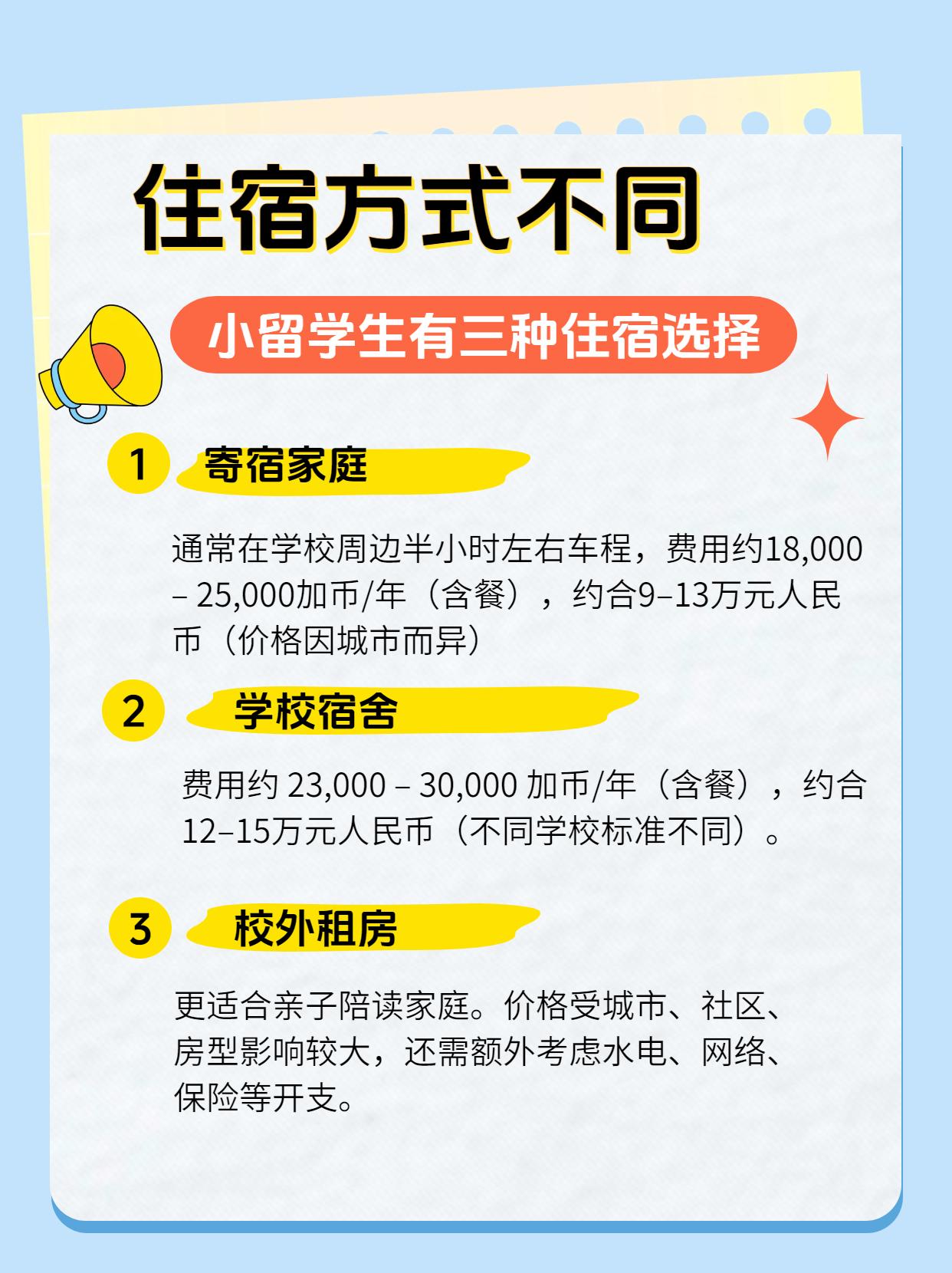 值得大家注意的是,公立学校学生大多选择寄宿家庭或家长陪读;多伦多、温哥华地区的生活成本普遍高于其他城市。