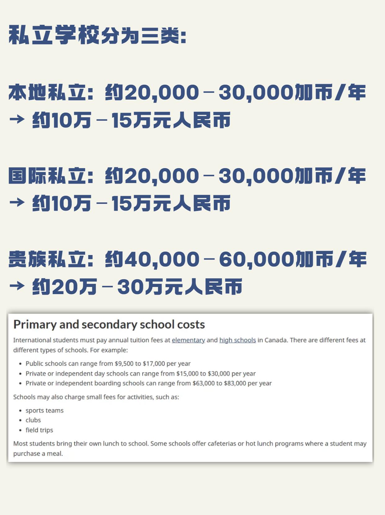通过图1至图5总体来看,在加拿大读中学,一年的总花费大致在3万 – 7万加币不等,折合人民币约16万 – 37万元,具体取决于你选择的学校类型、所在城市和住宿方式。