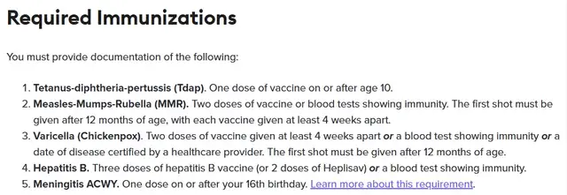 ✅了解必打疫苗:从学校官网下载并打印最新的疫苗表 (Immunization Form),上面标注了必须接种的疫苗和接种针数(一般要求百白破、麻腮风MMR、水痘、乙肝疫苗、流脑ACWY等);