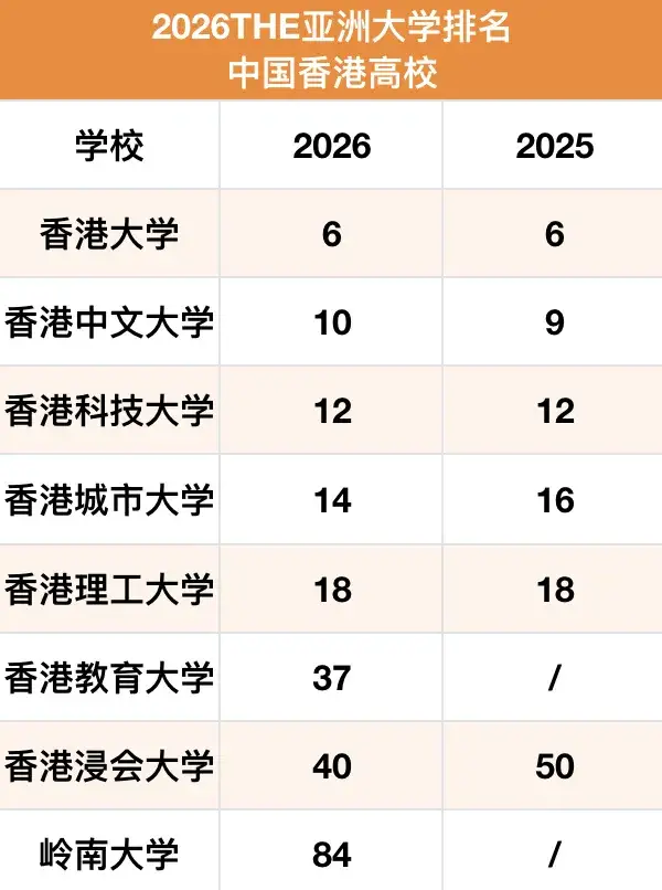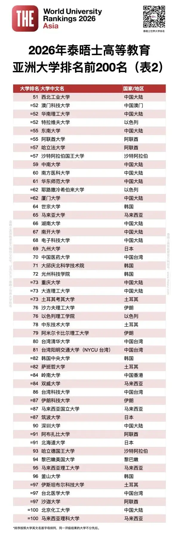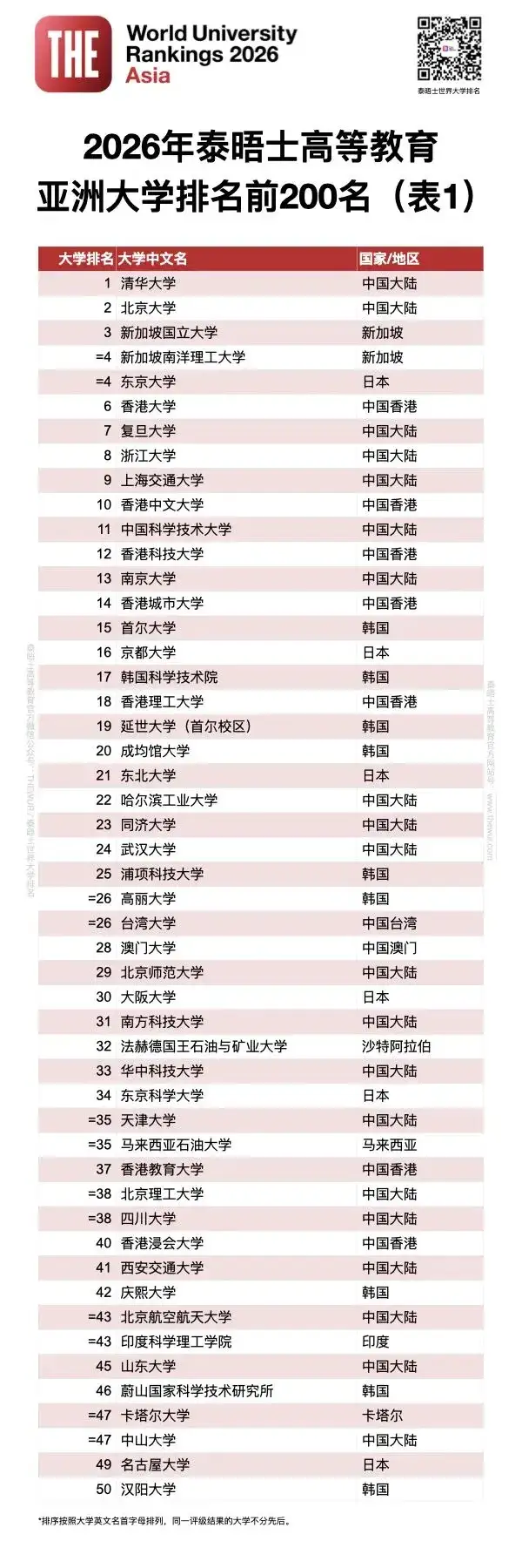 今天,泰晤士高等教育重磅发布了《2026年度亚洲大学排名》!