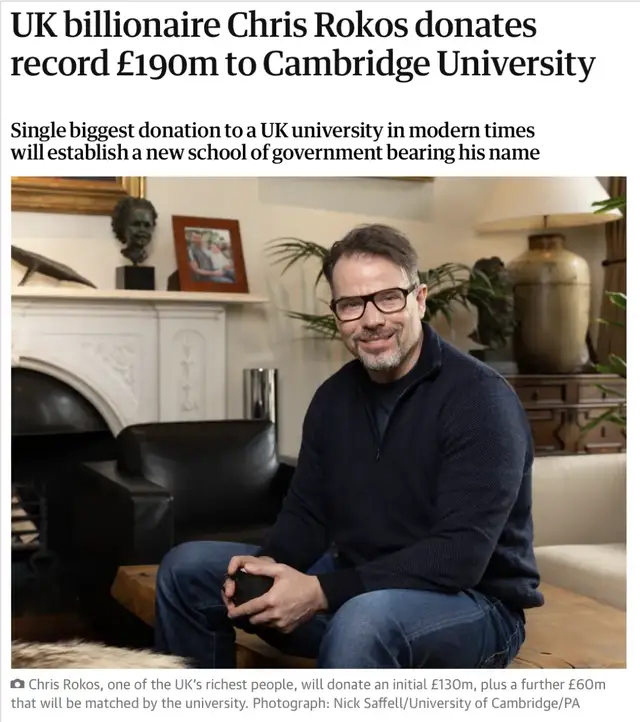 据《卫报》等多个媒体报道,英国亿万富翁、对冲基金经理Chris Rokos近日向剑桥大学捐赠了高达1.9亿英镑的巨款,用于创建一所全新的学院——罗科斯政府学院(Rokos School of Government)。